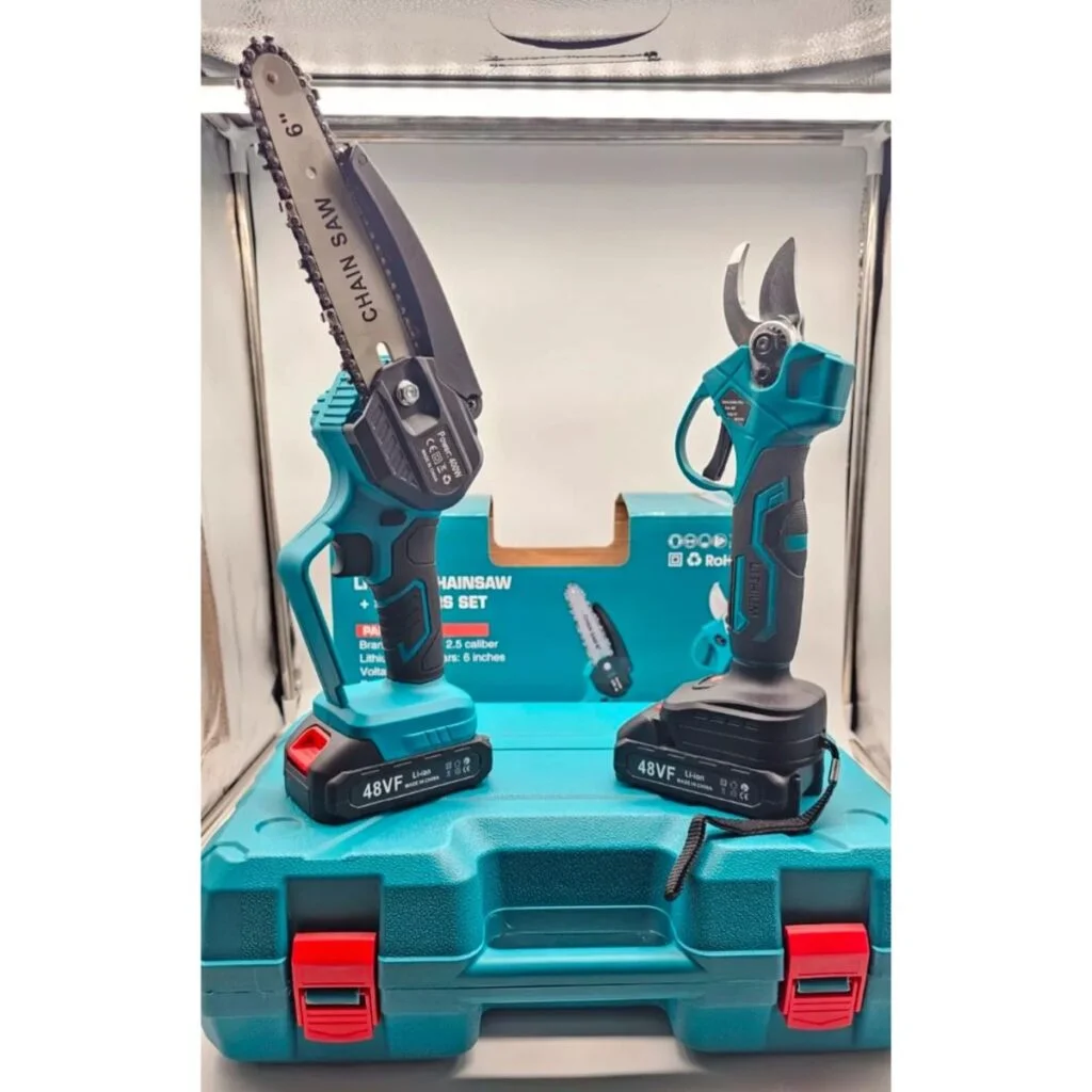 U set su uključeni: 1x škare, 1x mini motorna pila (6"), 2x kutije, 4x baterije, 2x punjača te svi dodatni mali dodaci.